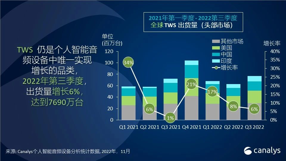 2022 年第三季度,TWS在印度的出货量到达了近 1000 万部的新高度,而无线颈挂式耳机的出货量则初次遭受下滑,降幅高达 20%。TWS产品品类的商场份额初次超越 50%,而整个印度商场的增加率放缓至 2%。Canalys分析师Ashweej Aithal表明:“本乡头部厂商活跃推行高性价比的设备并展开全面的商场教育,加快商场向TWS的过渡。但从整个商场的个位数的增加能够反映出,当时的商场需求已到达峰值。当商场需求到达峰值时,消费对产品质量的诉求也会逐步上升,例如寻求更佳的音质,更长的续航时刻以及自动降噪功用。而面临这种商场改变体现,厂商应该坚持敏锐并有所准备,供给质量更好的产品而且调整未来出货量级,使其坚持一个比较健康的库存水平。”