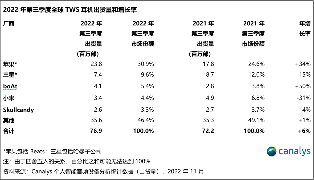 依据Canalys发布的最新数据,2022 年第三季度,全球个人智能音频设备遭受第二轮下滑,出货量下降4%,跌至1.136亿部。真无线耳机(TWS)仍然是个人智能音频设备(包含TWS、无线头戴、无线颈挂)中仅有完成增加的品类,在本季度增加6%,到达 7690 万部。苹果(包含Beats)发布第二代AirPods Pro后,其出货量增加了 34%,商场份额到达 31%,安定了其商场领先地位。三星(包含哈曼子公司)位居第二,虽然推出了全新Galaxy Buds2 Pro,其出货量仍下降了 15%。印度本乡厂商boAt以 5% 的商场份额位居第三,但其增加快度有所放缓,同比增加 50%。小米和Skullcandy别离以 4% 和 3% 的商场份额位居第四和第五。