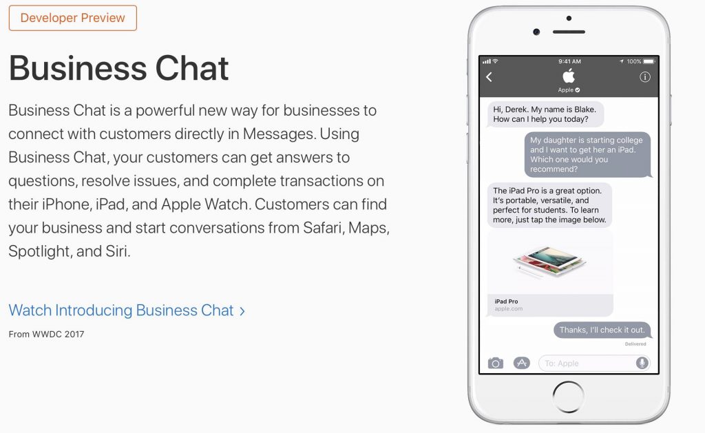 其实,苹果是想将B2C通讯、付出、客服集体吸引到自己的途径,让它们远离其它途径Facebook、Google和Twitter等途径。本月,WhatsApp 也推出了自己的“WhatsApp Business”应用程序,所以苹果要想完成这一方针,需求后发制人。