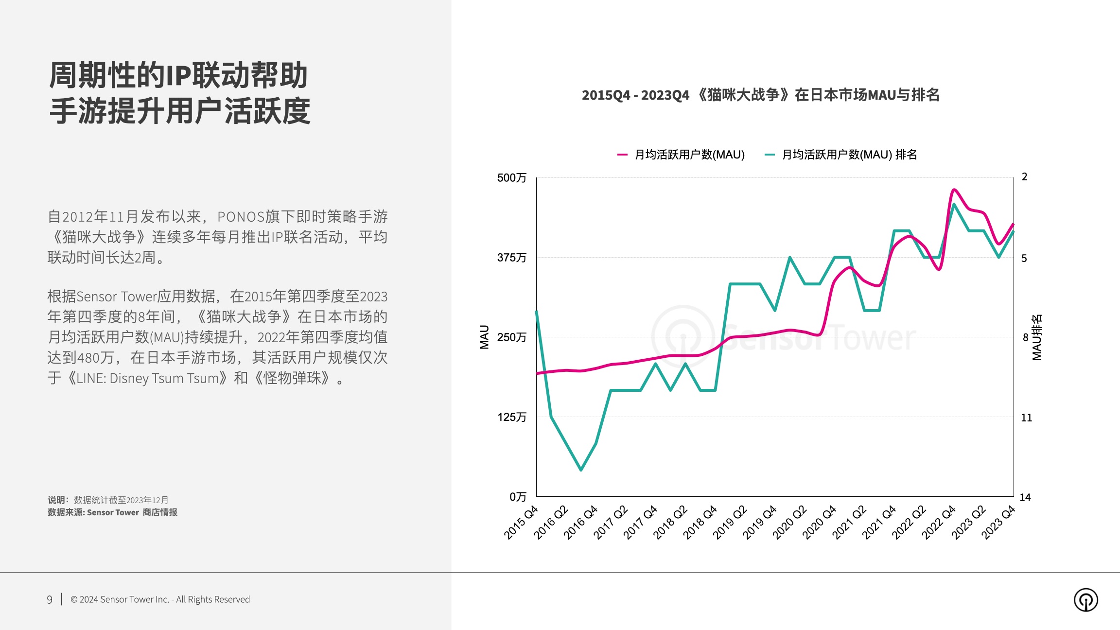 PONOS旗下即时战略手游《猫咪大战役》自2012年11月发布以来继续推出IP联名活动,促进《猫咪大战役》日本商场月均活泼用户数(MAU)及排名不断提高。2022年第四季度,该游戏在日本商场活泼用户规划到达480万,仅次于《LINE: Disney Tsum Tsum》和《怪物弹珠》。