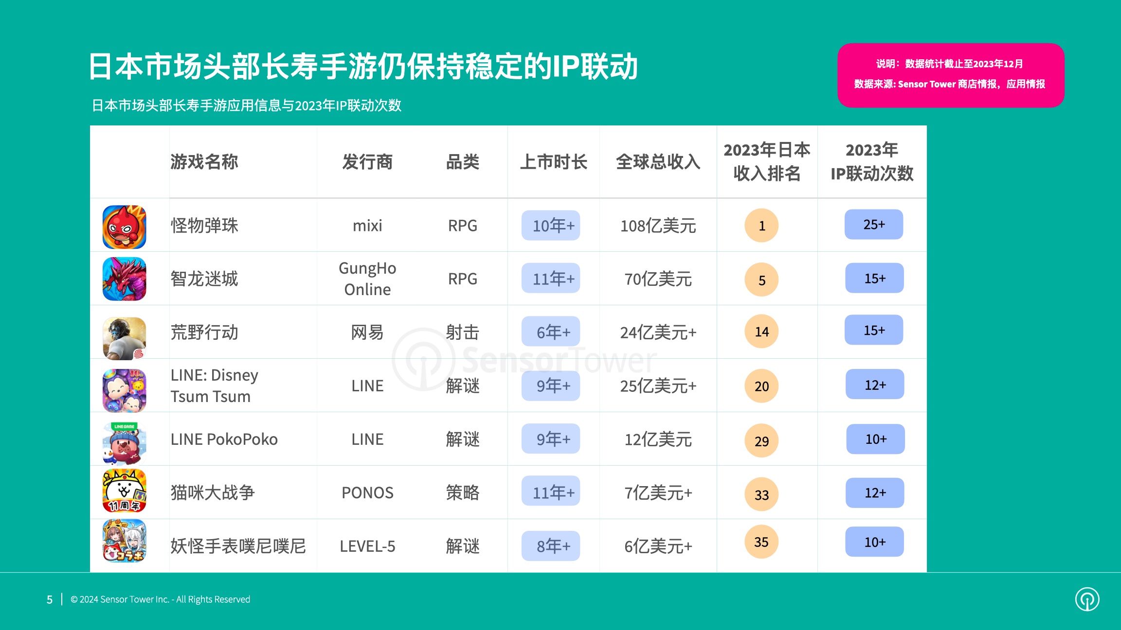 依据Sensor Tower发布的洞悉陈述,IP联动成为日本抢手手游坚持长时间抢先的诀窍之一,《怪物弹珠》、《智龙迷城》、《LINE: Disney Tsum Tsum》、《猫咪大战役》等多款长命手游2023年IP联动仍旧频频。其间《怪物弹珠》IP联动超越25次,全球累计收入到达108亿美元,再次闻名日本手游收入榜冠军宝座。