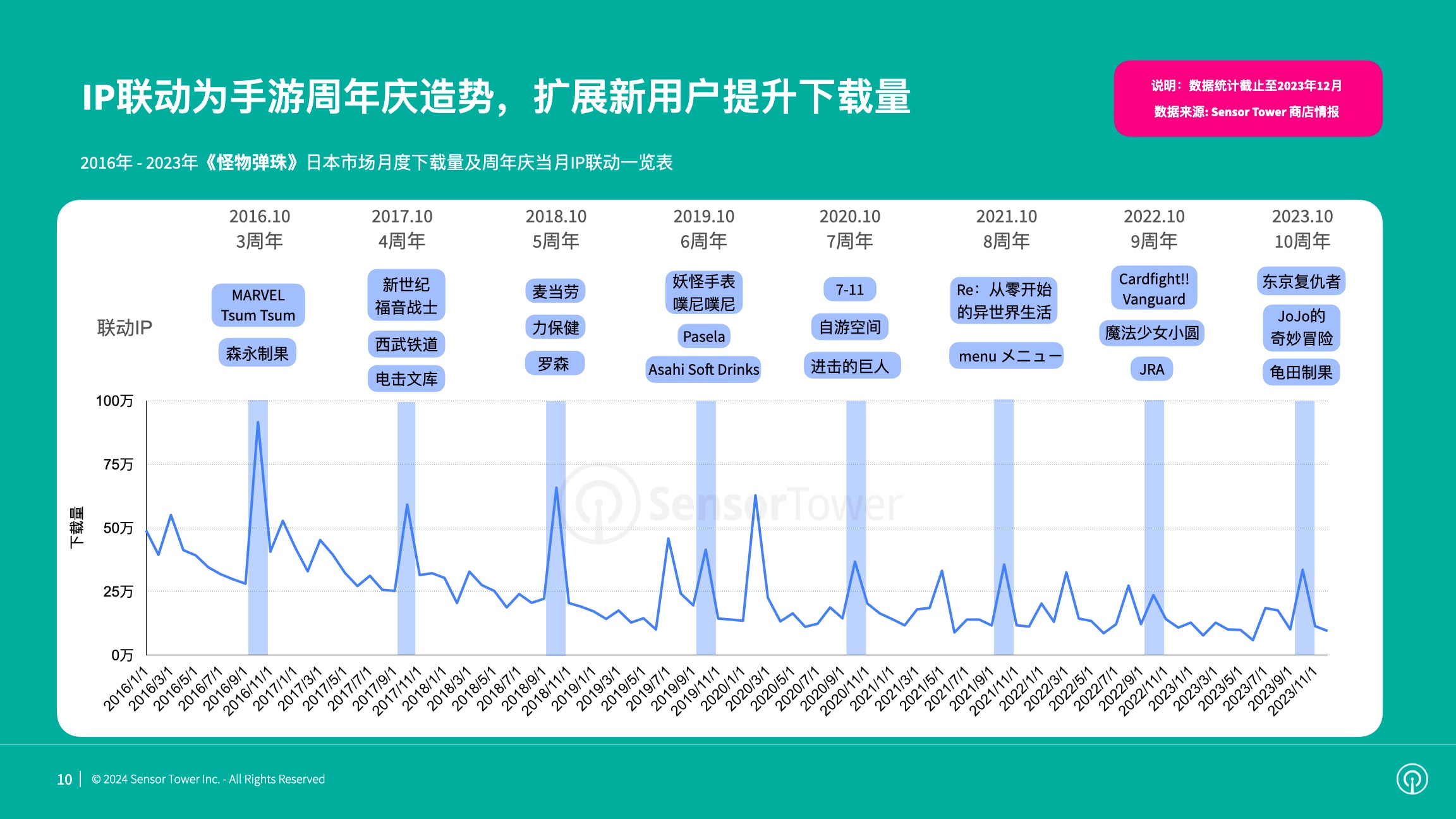 《怪物弹珠》从2014年开端便敞开了每月的IP联动,月均联动次数超越2次,周年庆当月IP联动愈加频频。IP联动为周年庆造势,助力《怪物弹珠》触达新的用户群,推进下载量再攀顶峰。